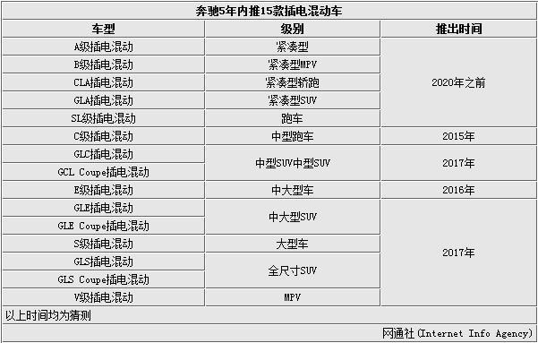 在欧洲排放标准日渐严格的情况下,众多车企纷纷发展插电混动与纯电动车型,奔驰此前便推出了S500Plug-in Hybrid。近日,奔驰官方透露:奔驰计划到2017年推出10款插电式混动车型,这些插电式混动车型将涵盖多个车系,包括C级、全新E级及GLC级等。此前奔驰S级的研发负责人托马斯·韦伯表示:“未来奔驰旗下的每一款量产车都将推出一款插电式混合动力版本的车型。”到2020年,奔驰A级、奔驰CLA等一系列基于前驱平台打造而来的车型也将会推出像对应的插电式混合动力的型号。届时,奔驰将有15款插电混动车型出自奔驰全新前驱与后驱平台,而上述车型也将全部引入国内市场。